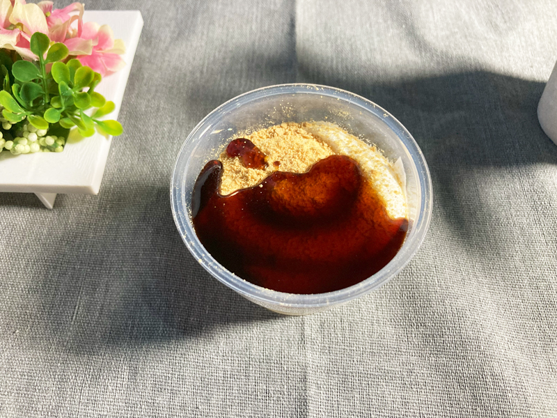 この商品は、本体にはホイップクリームの下にわらび餅があり、さらに一番上にはきなこがトッピングされています。付属の黒みつは別添されており、自分の好みに合わせて調整することができます。