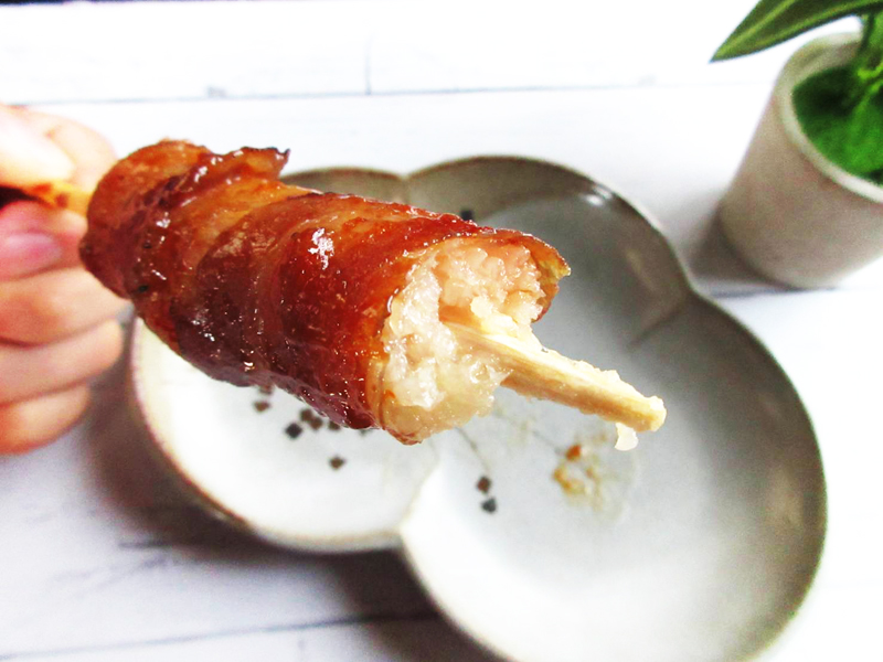 醤油ベースの味付けで、もちもち食感のご飯を甘辛の豚バラ肉で巻き上げた串です。