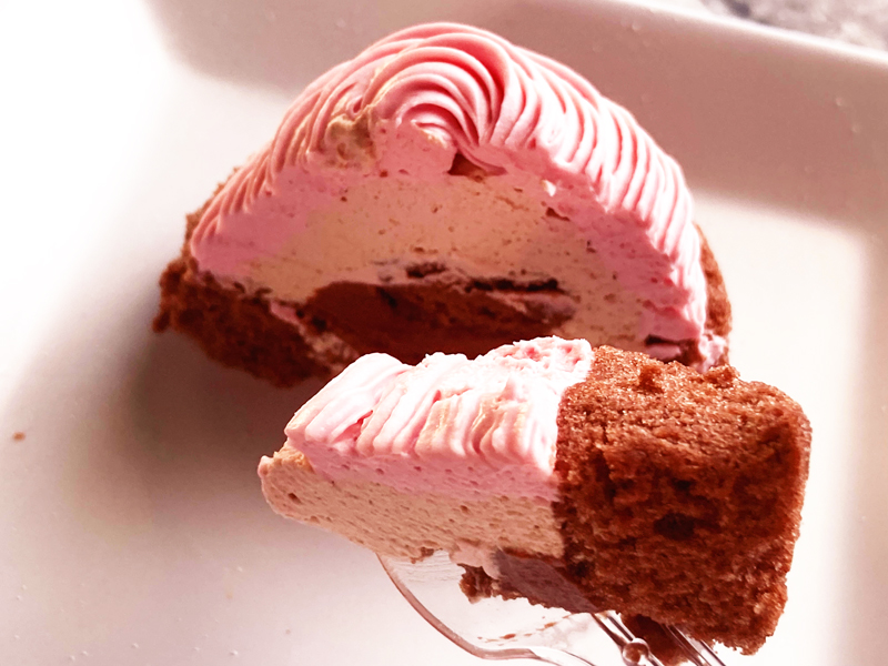 このケーキは、いちごチョコクリーム、ミルクチョコクリーム、ミルクチョコガナッシュ、そしてココアスポンジが絶妙に重なり合っています。それぞれの層が織りなすハーモニーが、見た目にも味わいにも満足感を与えてくれそうですね!